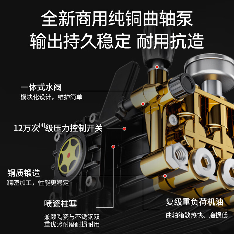 全新商用純銅曲軸泵,精密加工性能更穩(wěn)定,模塊化設(shè)計維護(hù)簡單,兼顧陶瓷與不銹鋼雙重優(yōu)勢耐磨耐損,鋼絲編織防爆高壓管,三層耐磨,高壓管可承受-20~65,可承受的壓力范圍0-500kg,多重防護(hù)IPX5防水認(rèn)證,清洗安全有保障