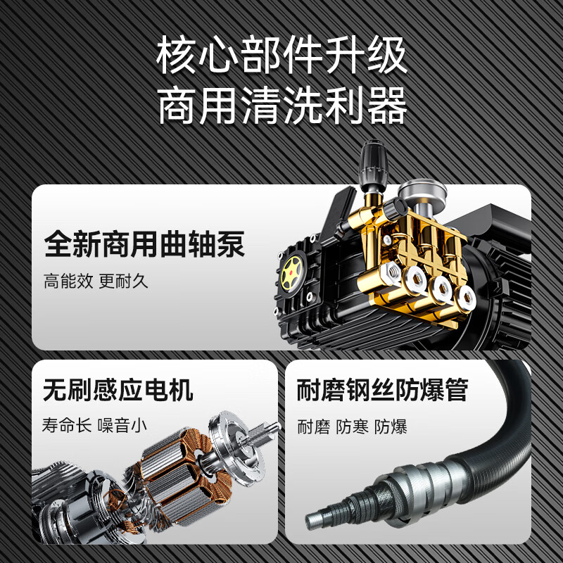 全新商用純銅曲軸泵,精密加工性能更穩(wěn)定,模塊化設(shè)計維護(hù)簡單,兼顧陶瓷與不銹鋼雙重優(yōu)勢耐磨耐損,鋼絲編織防爆高壓管,三層耐磨,高壓管可承受-20~65,可承受的壓力范圍0-500kg,多重防護(hù)IPX5防水認(rèn)證,清洗安全有保障