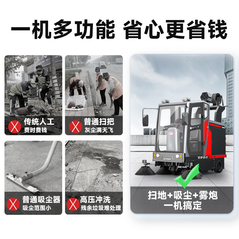 室外駕駛式掃地車(chē)掃地/吸塵/排噴,每小時(shí)清掃21000㎡,清掃寬度2100mm,續(xù)航時(shí)間4-5h,后排噴前噴霧雙功能,不用擔(dān)心滿(mǎn)天的灰塵。